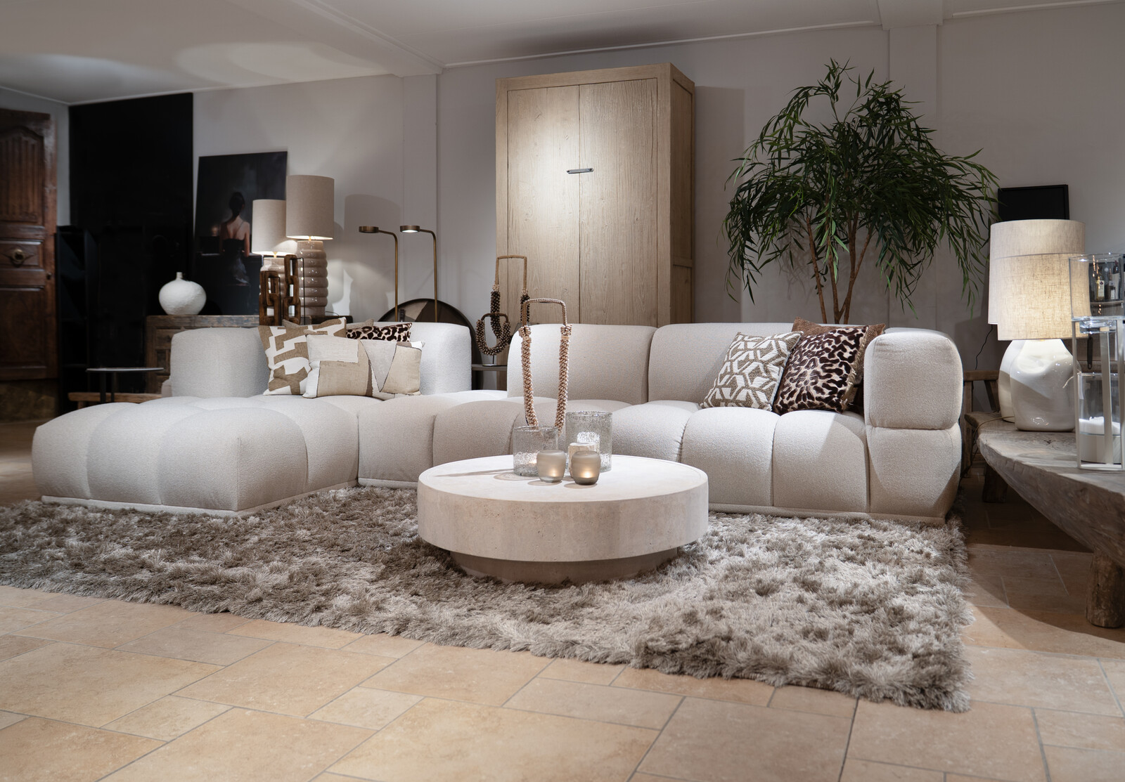 De ronde plafondplaat van 35 centimeter in cacao-kleur draagt twee Quinto kappen en één Run cilinder, elk met een eigen lichtbron. De kappen hebben beide een andere diameter wat een sierlijk effect geeft. De eerste kap heeft een diameter van 24 cm en de tweede een diameter van 29 cm. De combinatie van opengewerkte kartonlagen en de cacao ophanging zorgt voor een speels spel van licht en schaduw boven de eettafel of in de woonkamer.